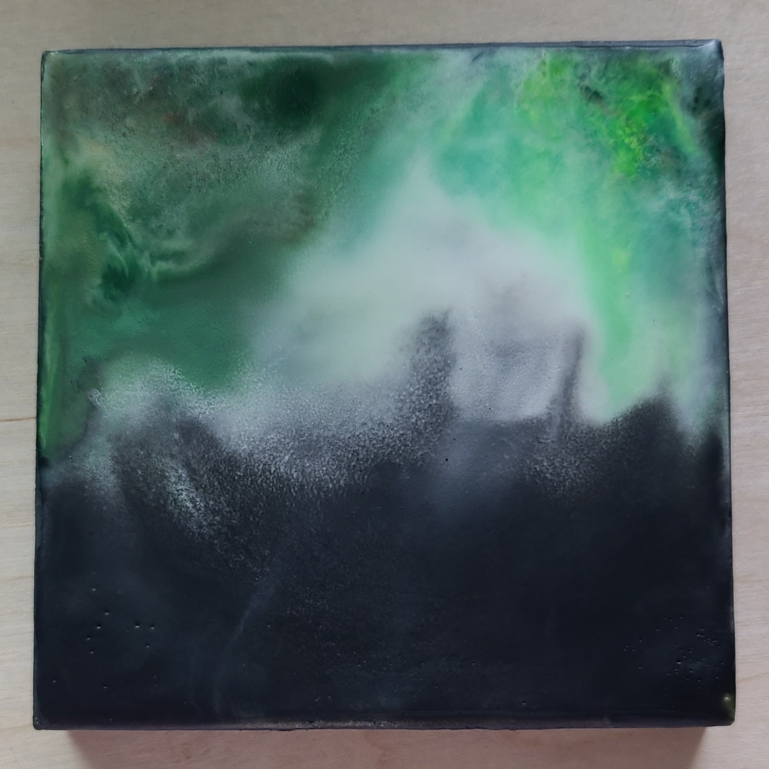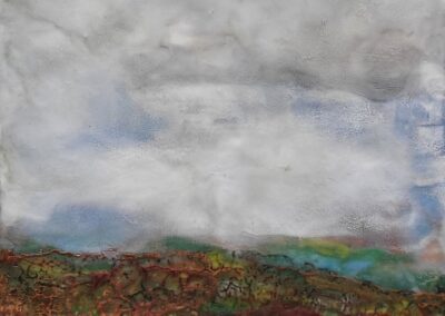 The technique involves melting damar resin crystals in beeswax and adding dry pigments. The hot wax is applied to a rigid surface and quickly hardens. Heat is then applied to the wax paint, fusing the pigmented wax. The literal meaning of the word encaustic is from the Greek “encaustikos” or burning-in which refers to this step in the process. Once the wax paint cools additional layers can be added to achieve depth and texture. Oil paints, oil pastels, dry pigments, metal leaf and other substances can be worked into or layered onto the wax. Each layer must be fused with the layer below. Once the surface has cooled, the paint hardens to a permanent finish that can be worked to the rich and lustrous patina that is the hallmark of encaustic painting.